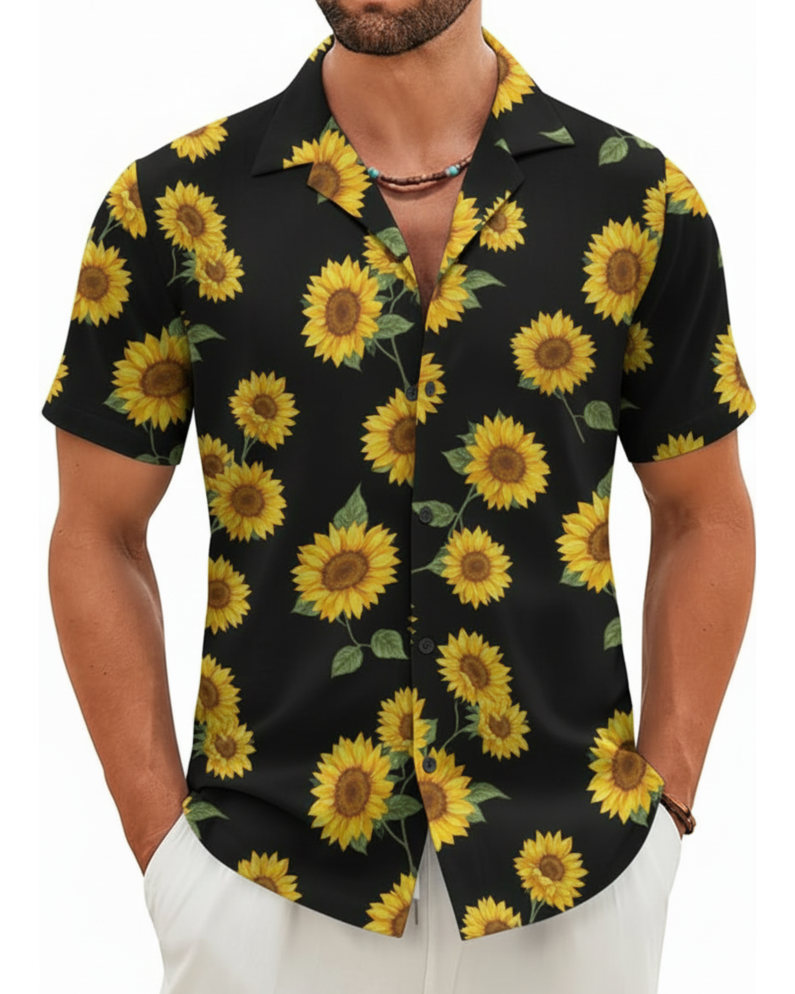 • Vibrant Floral Printed Patterns: Bold tropical prints with sunflowers and exotic flowers. These mens floral Hawaiian shirts bring authentic island vibes with bright, fade-resistant colors